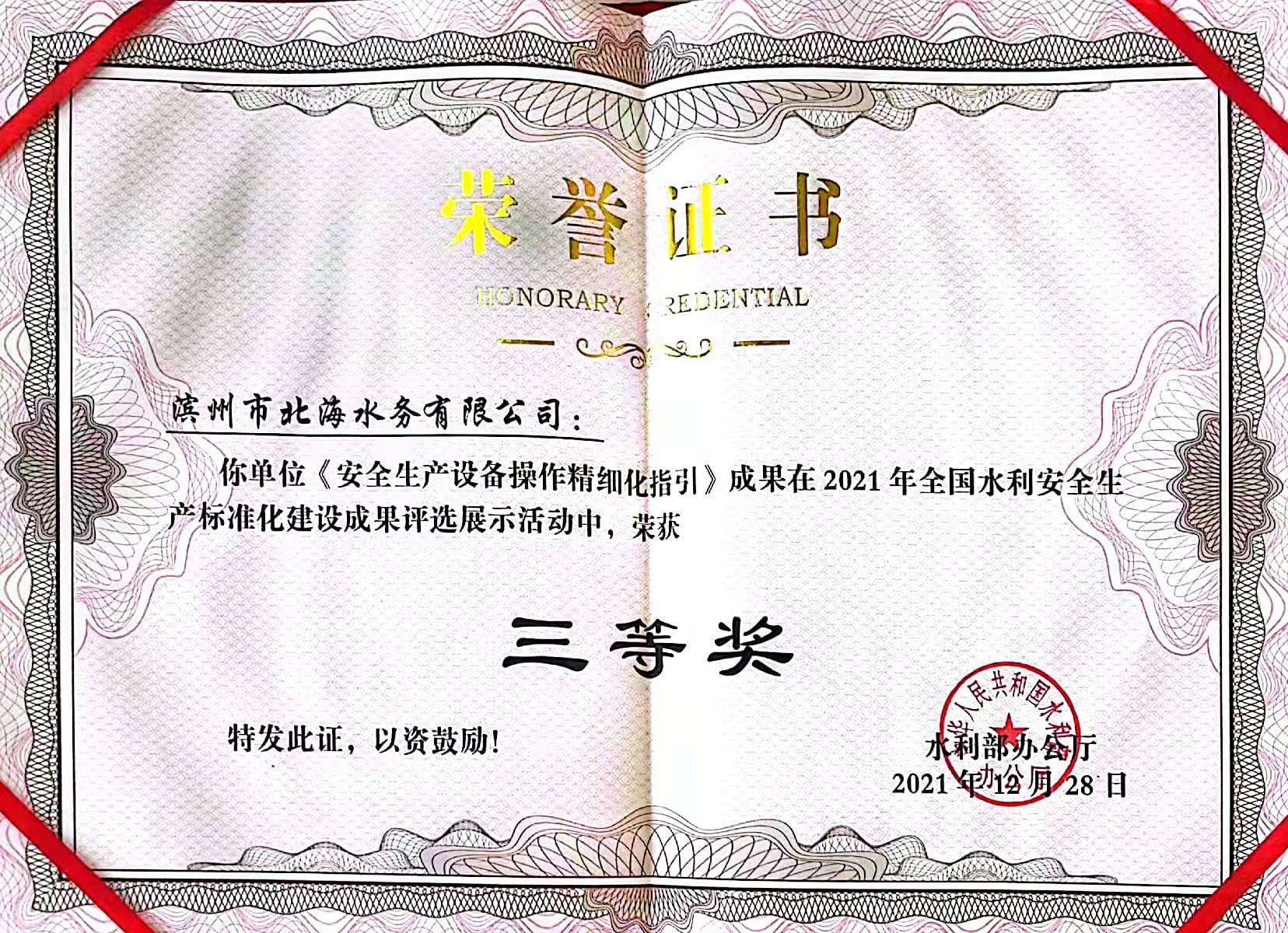 近日,水利部公布全国水利安全生产标准化建设成果评选展示活动获奖名单,滨州市北海水务有限公司报送的《安全生产设备操作精细化指引》在2021年全国水利安全标准化建设成果评选展示活动中脱颖而出,荣获三等奖。